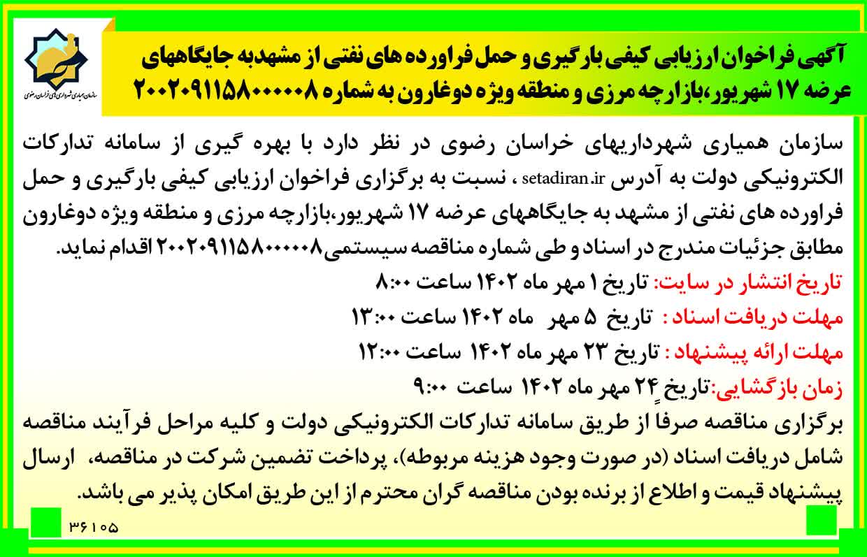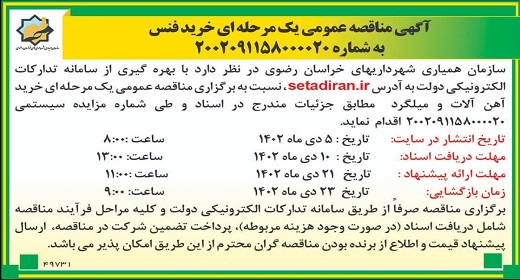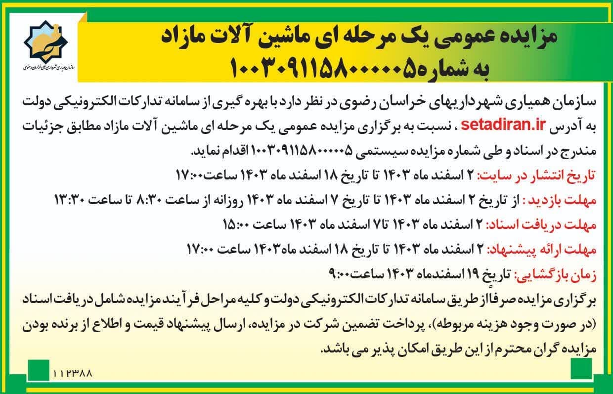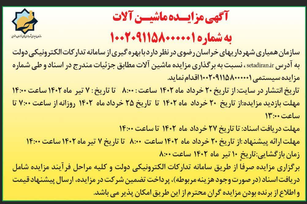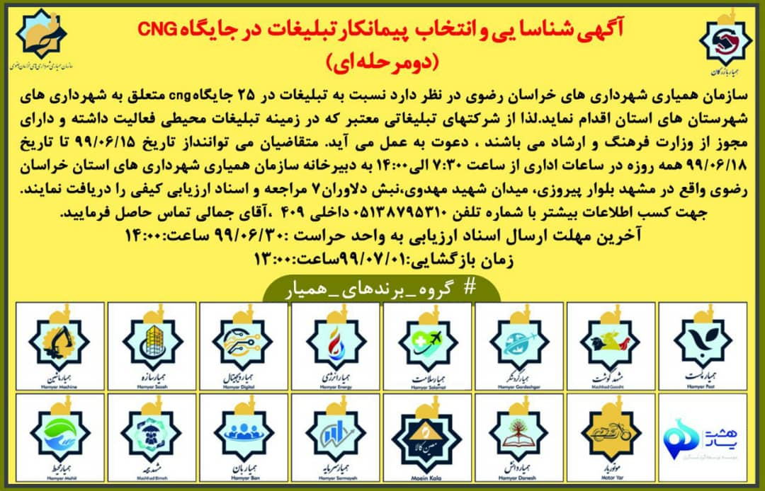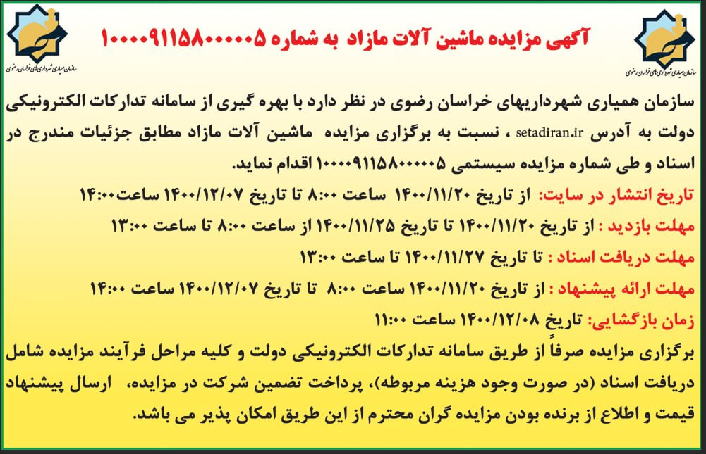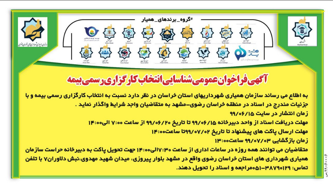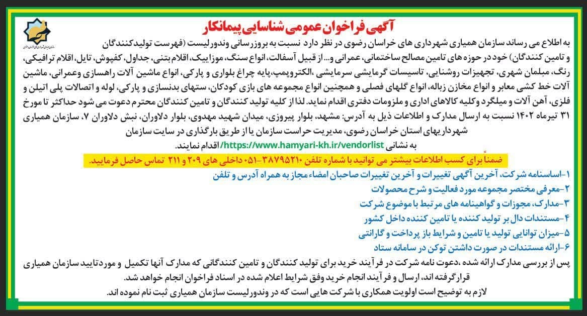 آگهی فراخوان عمومی شناسایی پیمانکار سازمان همیاری شهرداریهای خراسان رضوی