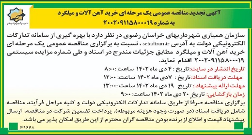 آگهی تجدید مناقصه عمومی یک مرحله ای خرید آهن آلات و میلگرد به شماره 200209115800019