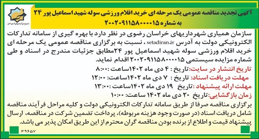 آگهی تجدید مناقصه عمومی یک مرحله ای خرید اقلام ورزشی سوله شهید اسماعیل پور 24 به شماره 2002091158000015