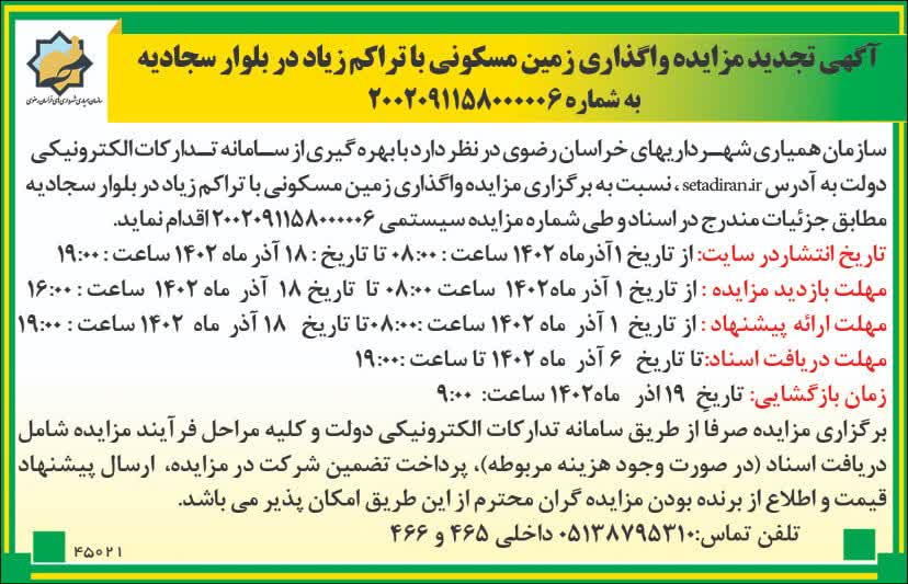 آگهی مزایده واگذاری زمین مسکونی تراکم زیاد در بلوار سجادیه ( اراضی الکترود رضا)